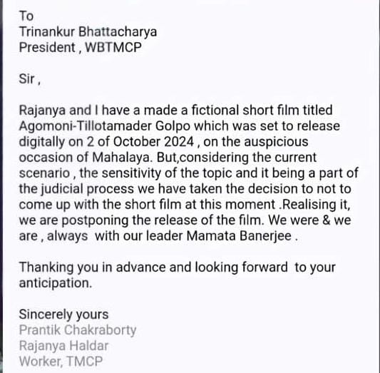 যে স্বল্প দৈর্ঘ্যের ছবির পোস্টারকে ঘিরে এত বিতর্ক, সেই ‘আগমনী….তিলোত্তমাদের গল্প’ আগামী ২রা অক্টোবর মহালয়ার দিনেই মুক্তি পাওয়ার কথা ছিল। এই ফিল্ম পরিচালনার দায়িত্বে রয়েছেন দল থেকে সাসপেন্ড হওয়া আরেক ছাত্রনেতা প্রান্তিক চক্রবর্তী। ফিল্মের পোস্টারে নতুন সংযোজিত ক্যাপশন ‘প্রচারে নেই, বিচারে আছি।’