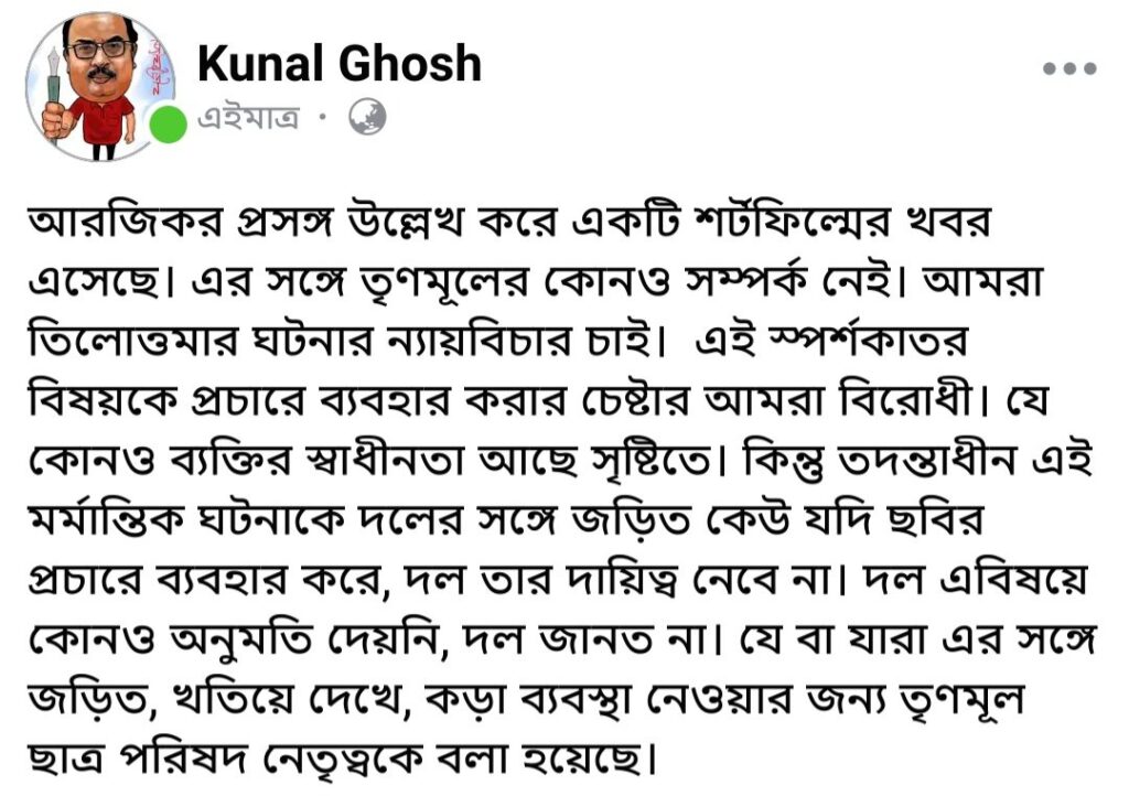 আরজি কর ইস্যুতে বানানো শর্ট ফিল্মের রিলিজ আপাতত স্থগিত রাখলেন রাজন্যা হালদার। সোমবার রাজন্যা এবং তাঁর বন্ধু প্রান্তিক চক্রবর্তীর তরফে ই-মেল করে বিষয়টি তৃণমূল ছাত্র পরিষদের রাজ্য সভাপতি তৃণাঙ্কুর ভট্টাচার্যকে জানানো হয়। বর্তমান পরিস্থিতির কথা বিবেচনা করে ও বিচারবিভাগীর প্রক্রিয়ায় আস্থা রেখে তারা মেইলে জানান, “এই মুহূর্তে স্বল্পদৈর্ঘ্যের ছবিটি প্রকাশ করব না। আমরা এই শর্ট ফিল্মটির রিলিজ স্থগিত রাখছি।”